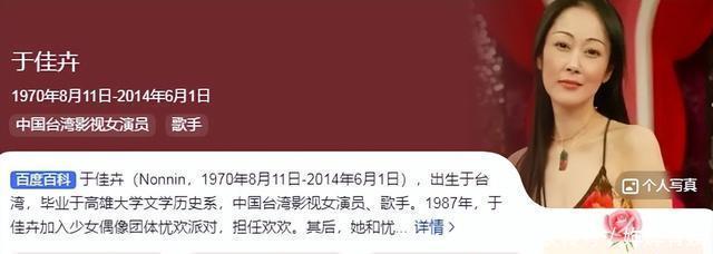 于佳卉43岁 她是《京城四少》中的“柳芽儿”,也是《白发魔女》中的“何萼华”。 正如剧中她悲惨的命运一样,于佳卉现实中也十分悲惨。 于佳卉出道便是巅峰,她靠着加入少女偶像团体忧欢派对而出道。