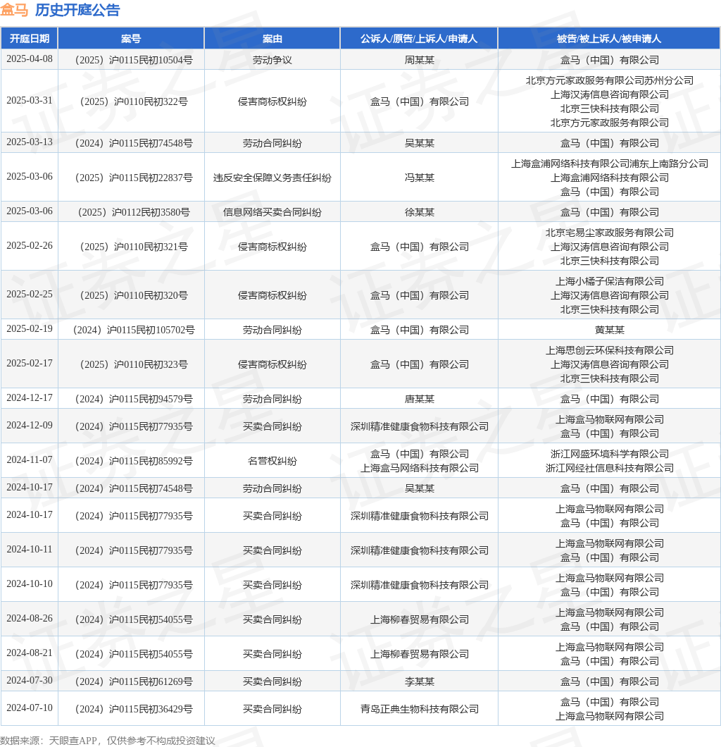 案号:(2025)沪0110民初321号审理法院:上海市杨浦区人民法院案由:侵害商标权纠纷当事人信息: 原告/上诉人:盒马(中国)有限公司 被告/被上诉人:北京宅易尘家政服务有限公司、上海汉涛信息咨询有限公司、北京三快科技有限公司开庭日期:2025年2月26日根据统计,近一年内以盒马(中国)有限公司为当事人的历史开庭公告有22则,其中案由为“买卖合同纠纷”的公告以9则居首,其次为“劳动合同纠纷”有5则,“侵害商标权纠纷”有4则。历史开庭公告(前20条)如下: